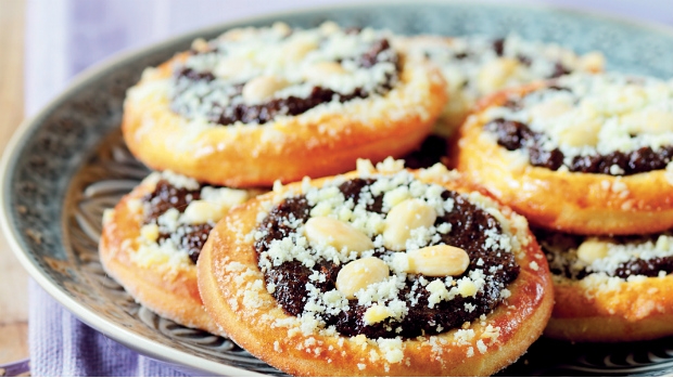 Z vykynutého těsta si pomoučněnou rukou odebírám kousky asi velikosti pingpongového míčku, ne více, těsto ještě nakyne při pečení. Na plech vyložený pečícím papírem kladu jednotlivé kuličky, které jemně připlácnu rukou a potom skleničkou vytvaruju důlek, jde to taky pomocí lžíce, ale sklenička funguje lépe. Nechám mezi koláčky místo, protože ještě při pečení nabudou. Každý koláček pak zvrchu naplním čím chci a posypu drobenkou. ( drobenka se v době pečení celkem rozteče, možná by bylo lepší ji tam dát později). Ještě okraje pomažu vajíčkem, je lepší to udělat ještě před drobenkou, ale dá se i pak.