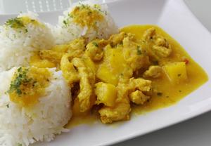 Nejprve zpěním cibuli, přidám maso nakrájené na kostičky a chvíli osmahnu (maso zůstává bílé). Přidám kari a sojovou omáčku a zaleju celé hrníčkem vody s rozpuštěným bujonem (tak aby maso nebylo ponořené, ale téměř ano) a nechám dusit cca 25min. Nakonec přidám smetanu spolu s moukou, kterou si rozmíchám v míse se smetanou předem. Nechám projít varem asi 3 min. Podávám s rýží.