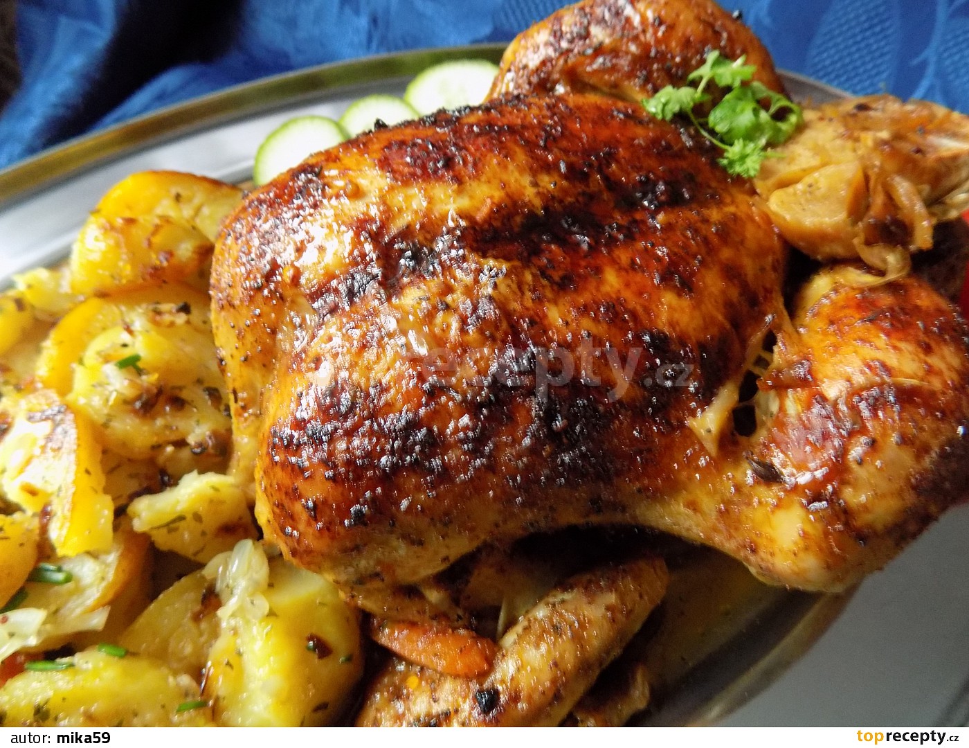Peču 40 min, kuře pložím prsama dolů. Po 40 min kuře otočím, znovu potřu máslem, posypu grilovacím kořením a paprikou a peču dalších 40 min. v průběhu pečení můžu občas polít vypečenou šťávou.