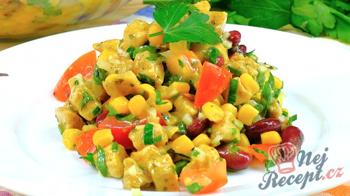 kuřecí maso nakrájím na malé kousky, posypu kořením na maso a spolu s cibulí, kukuřicí a hráškem ho dám na pánev a přikryju pokličkou. Nechám pár minut dusit do změknutí masa. Nakrájím rajčata, přidám plechovku fazolí a smíchám s masovou směsí. Všechny ingredience na zálivku smíchám a zaleju tím salát. podávám s pečenými bramborami.