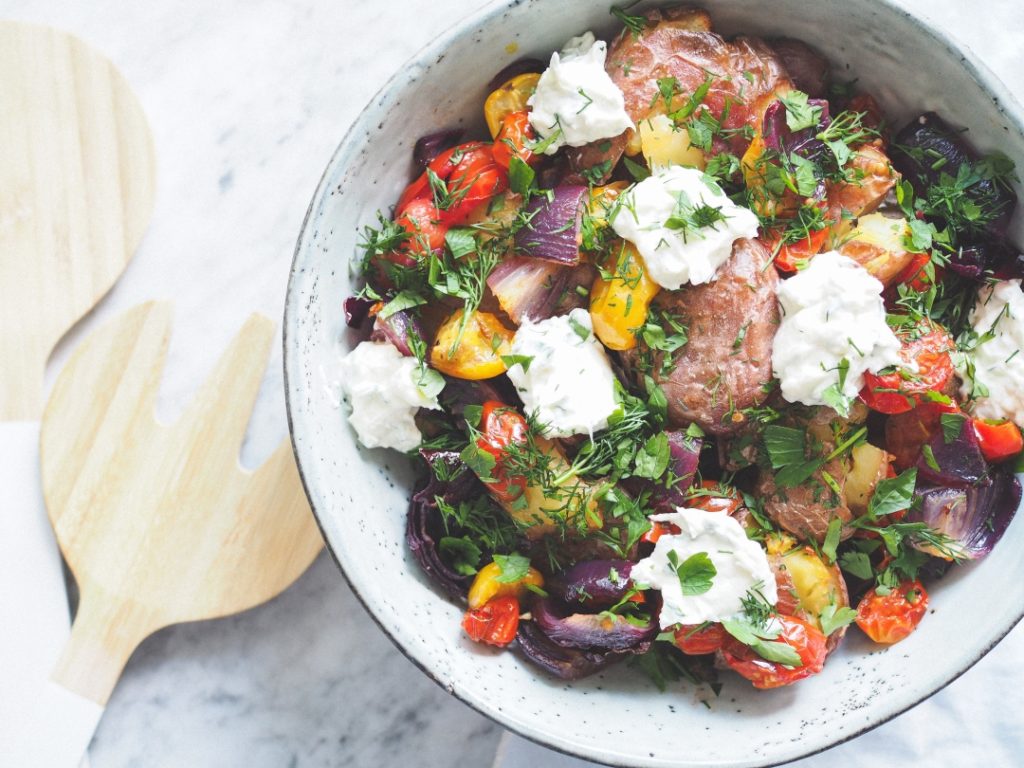 Brambory a rajčata s cibulí jsem přemístila ještě teplý do misky, zasypala bylinkama a promíchala s tvarohovou směsí.